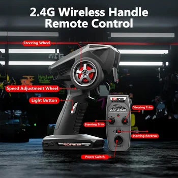 Built for rugged use, the drivetrain features adjustable metal tie rods, oil-filled metal shock absorbers, metal drive shafts, and premium wear-resistant gears and differentials. This robust structure protects the truck from power loss during stunts, bumps, drops, and flips, ensuring long-lasting durability for extreme RC adventures.