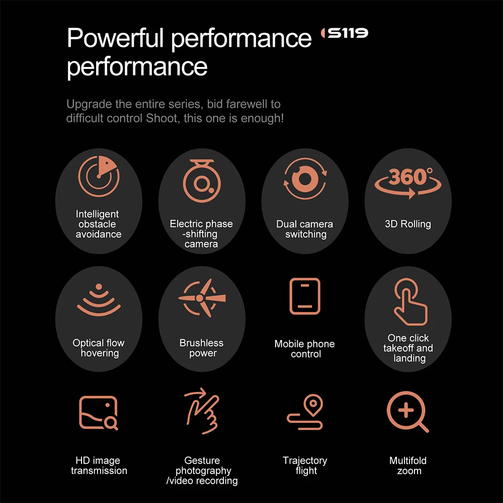 The S119 features intelligent obstacle detection sensors that automatically avoid collisions during flight – making flying safer and smoother. -